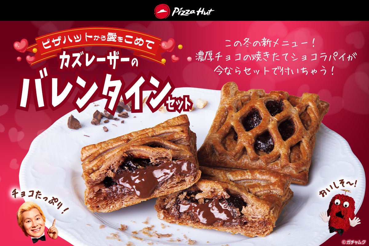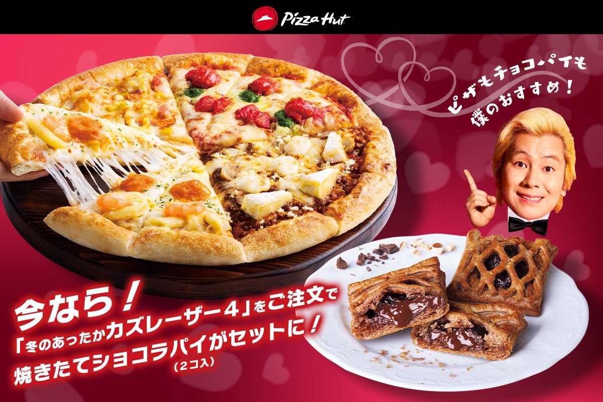 この「濃厚チョコの 焼きたてショコラパイ」が、バレンタイン期間の今ならカズレーザーおすすめの4種類の味が楽しめるピザ「冬のあったか カズレーザー4」とセットになってお楽しみいただけます!「濃厚チョコの 焼きたてショコラパイ」は2個入り1セットですので、大切な方とお二人で分けていただくなど、今年のバレンタインをちょっと特別にするために、ピザハットがお手伝いいたします。