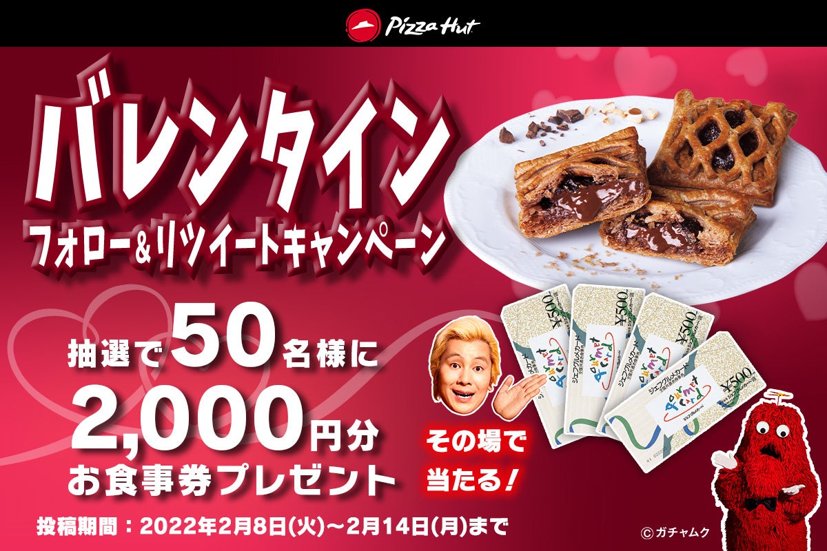 2022年2月8日(火)から2022年2月14日(月)の間、ピザハット公式Twitterアカウント(@Pizza_Hut_Japan / https://twitter.com/Pizza_Hut_Japan)をフォロー&リツイートで抽選で50名様に2,000円分のお食事券が当たるキャンペーンを開催します。