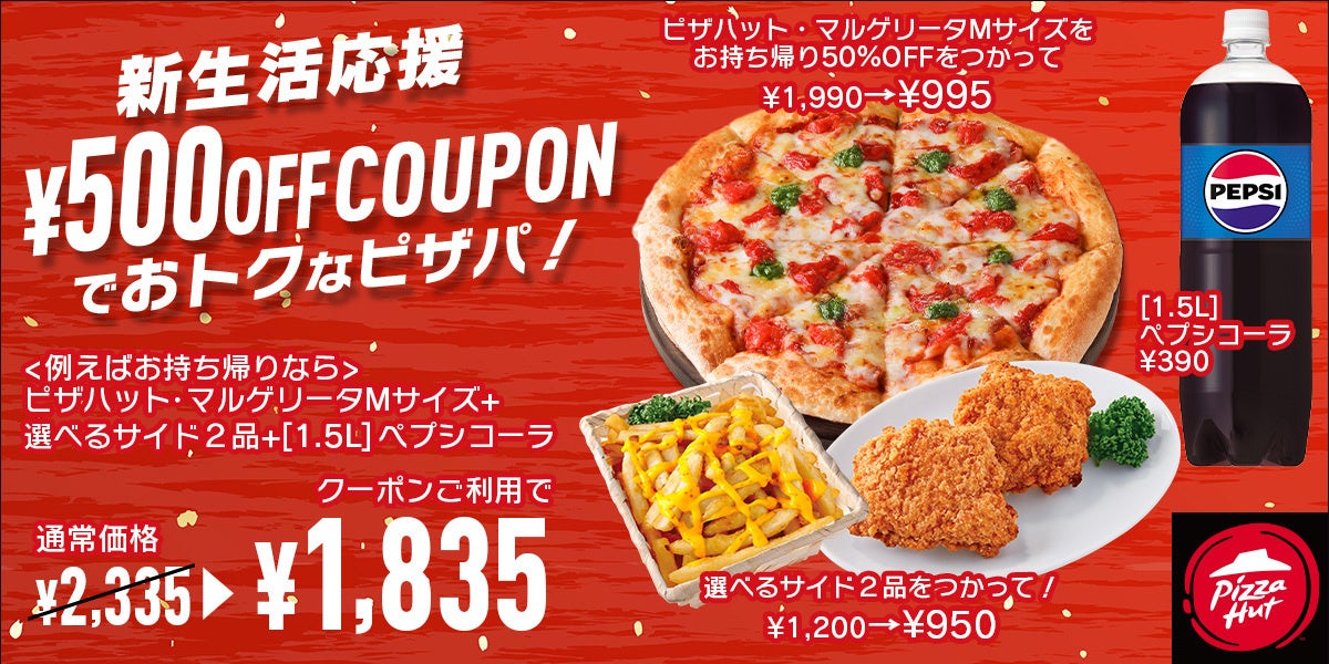 ピザハットは、春の訪れとともに新生活への第一歩を踏み出す方々への応援として、お持ち帰りなら2,300円以上のご注文、デリバリーなら配達料を除いて2,300円以上のご注文で、お会計が500円OFFになる「新生活応援 500円OFFクーポン」を配信いたします。