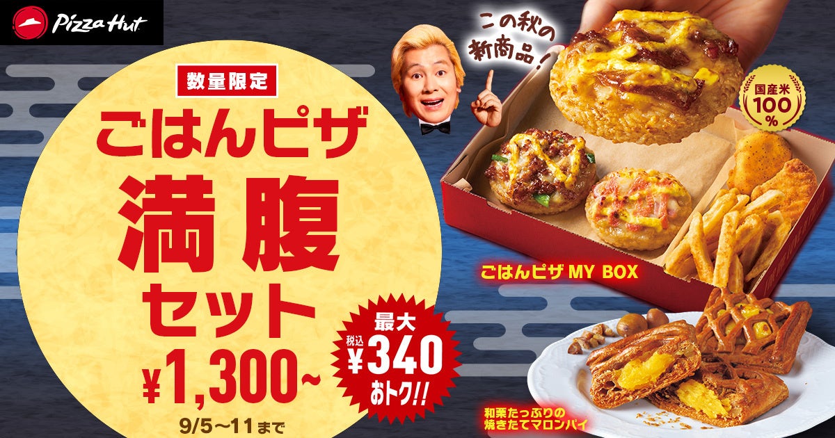 - 中秋の名月セールのおトクその②:この秋の新商品!「ごはんピザMY BOX」をご注文で「焼きたてマロンパイ」がおトクになって付いてくる「ごはんピザ満腹セット」