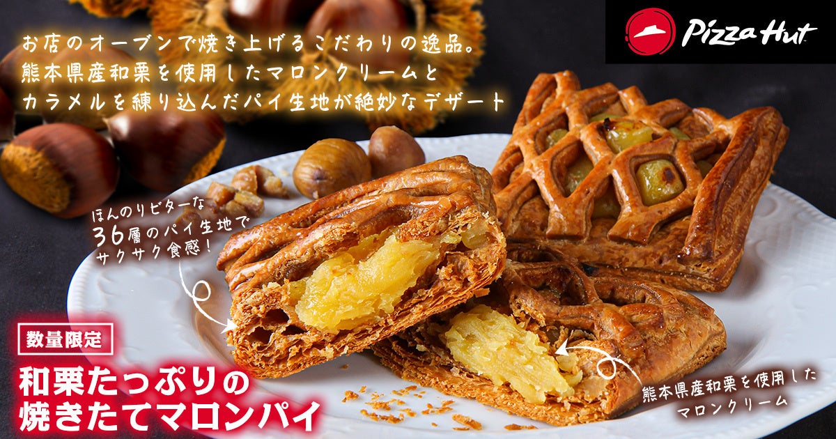 ピザハットの「和栗たっぷりの焼きたてマロンパイ」は、熊本県産和栗を使用したたっぷりのマロンクリームをこだわりのパイ生地に包んで焼き上げたこだわりのデザートです。カラメルを練り混んだ36層のパイ生地をご注文の直後にお店のオーブンで焼き上げることで、ほんのりビターな味わいとサクサクの食感が楽しめます。