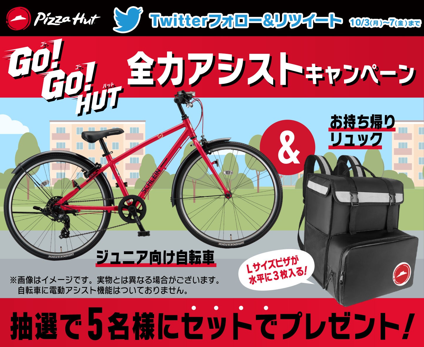 さらにお持ち帰りでおトクが盛りだくさんの「GO!GO!HUTセール」開催を記念して、「GO!GO!HUT全力アシストキャンペーン」を開催。ピザハット公式Twitterのフォロー&リツイートで5名様に、ピザをアツアツの状態で持ち帰ることができる、ジュニア向け自転車&お持ち帰りリュックのセットをプレゼントいたします。