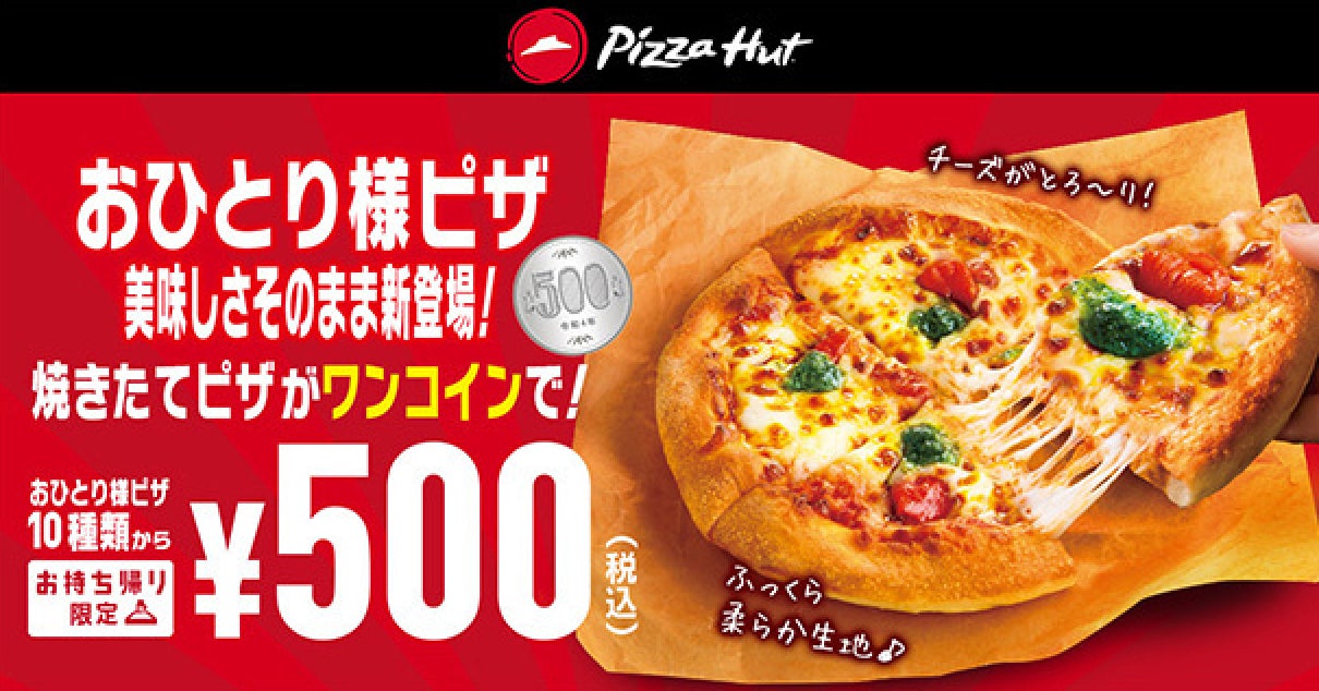 日本ピザハット株式会社(社長:中村 昭一、本社:神奈川県横浜市、以下:ピザハット)が展開する世界最大のピザチェーン「ピザハット」は、職業情報バラエティ「ジョブチューン」の人気企画「ピザットVS超一流ピザ職人 従業員が選んだイチ押し商品TOP10で勝負!」の番組放映内で、おひとり様ピザが満場一致合格をいただいたことを記念して10月17日(月)から、おひとり様ピザをワンコイン「500円(税込)」で販売いたします。