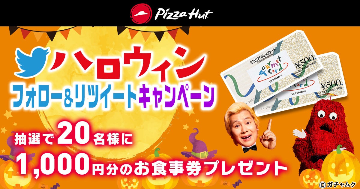 ハットのハロウィンウィークを記念して、ピザハット公式Twitterアカウント(@Pizza_Hut_Japan / https://twitter.com/Pizza_Hut_Japan)をフォロー&リツイートで20名様に「グルメカード」1,000円分が当たるキャンペーンを開催します。