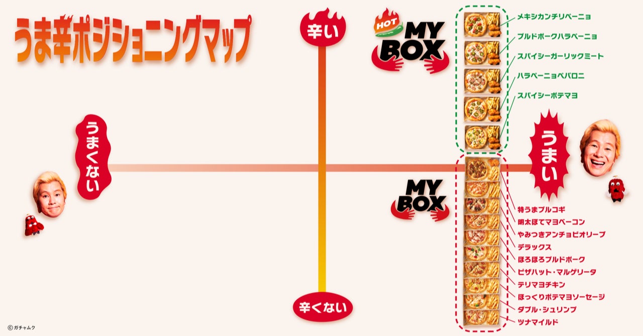 また「HOT MY BOX」には、ファンの間で根強い人気を誇る“ピザハットのサイドメニュー販売ランキングNo.1”のグリーンチリソースが付属※されており、Sサイズうま辛ピザにグリーンチリソースを追加でかける“追いグリチリ”をすることで自分好みの辛さに調整することも可能です。自分好みの味が一目で分かる「うま辛ポジショニングマップ」を参考に、ご自身にピッタリな辛さをお楽しみください。