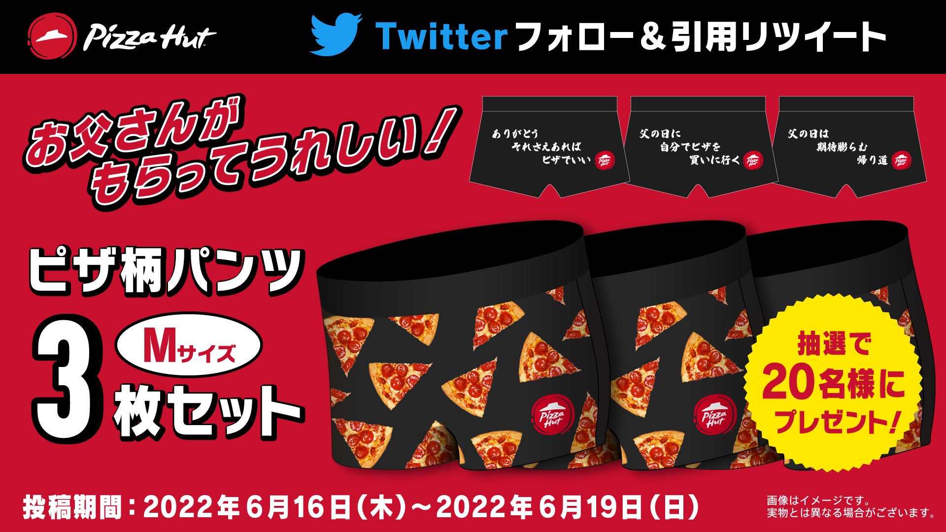 父の日3枚セットの発売を記念して、お父さんがもらってうれしい特別なプレゼントをご用意しました!父の日3枚セットがMサイズであることにちなんで、父の日の哀愁漂う川柳も入ったピザ柄パンツMサイズ3枚セットが抽選で20名さまに当たるTwitterフォロー&引用リツイートキャンペーンを開催いたします。