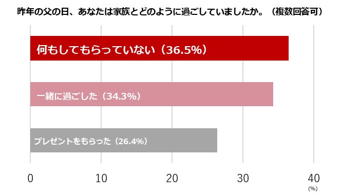 昨年の調査※では49.3%のお父さんが「家族と一緒に過ごしたい」と回答していました。そこで実際にどう過ごしたのか、お父さんを対象に調査したところ「何もしてもらっていない」が36.5%でトップという結果に。「家族と一緒に過ごした」と回答したお父さんは34.3%にとどまり、父の日の過ごし方の理想と現実にはギャップがあったことがわかりました。