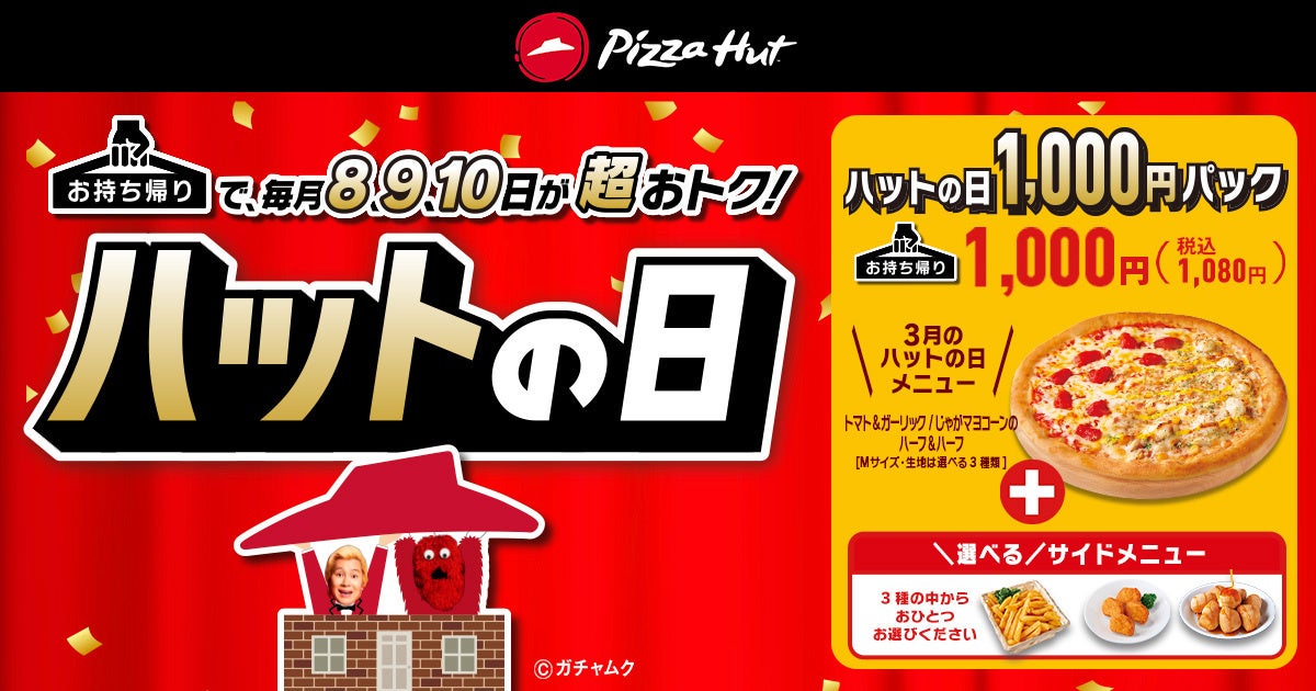 “ハット”にちなんで毎月8・9・10日は「ハットの日」!3月はMサイズの「トマト&ガーリック」と「じゃがマヨコーン」のハーフ&ハーフ+サイドメニュー1品(3品の中から1つ選べる)のパックをお持ち帰り限定で1,080円という超おトク価格で提供します。