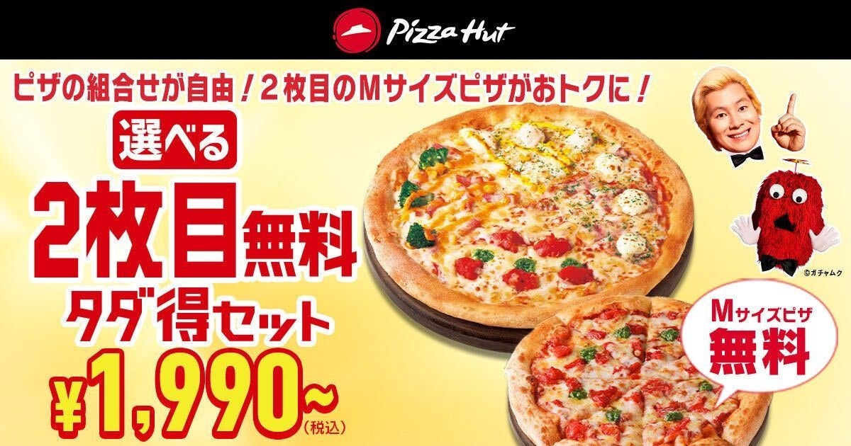 「選べる2枚目無料 タダ得セット」は、1枚目のピザを11種類の味からお好きなものを1つ選べ、さらにMサイズまたはLサイズのどちらかサイズも選べます。2枚目はMサイズのピザ限定で11種類の味から1つ選べるセットです。食べたい気分に合わせて量も味もお好みで組み合わせができて、さらに2枚目のMサイズピザは無料(タダ)でセットでついてくるのでとってもおトク!