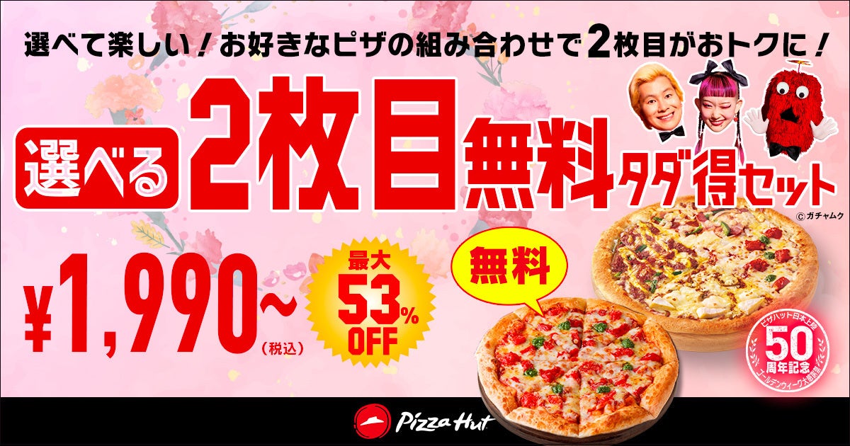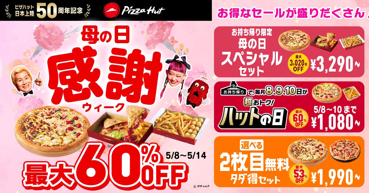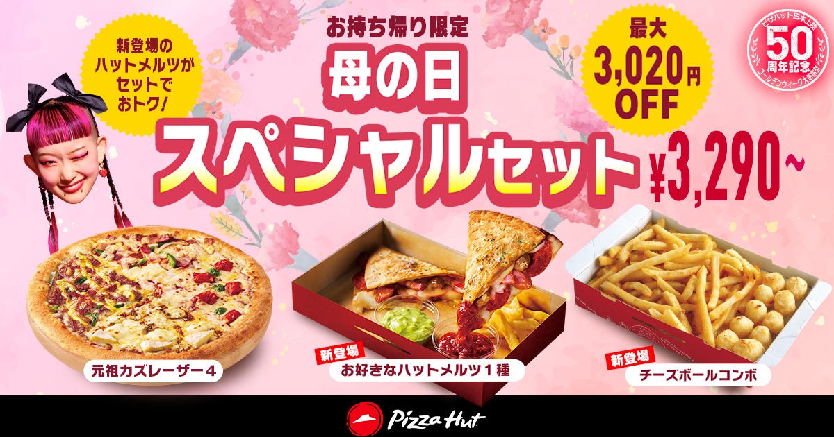 ピザハットは、日本上陸50周年の特別な母の日にご提供する「母の日感謝ウィーク」にて、3つの超おトクなセットをご用意しました!