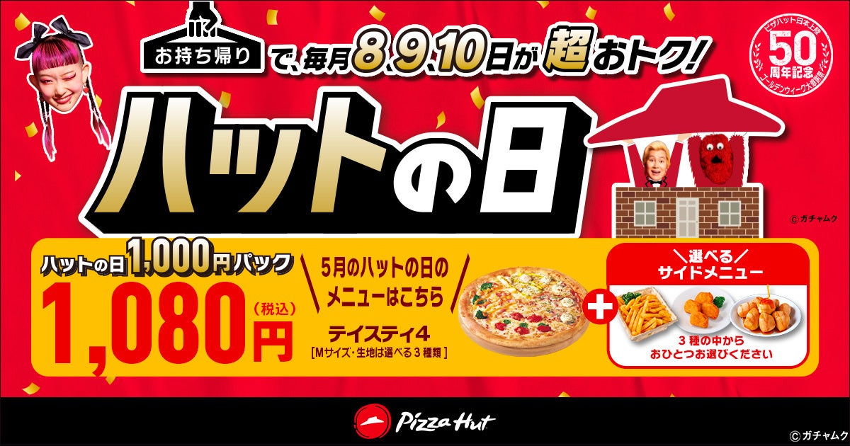 “ハット”にちなんで毎月8・9・10日は「ハットの日」!今月は、「テイスティ4」のMサイズピザ+サイドメニューの1品(3品の中から1つ選べる)パックをお持ち帰り限定で1,080円という超おトク価格で提供します。