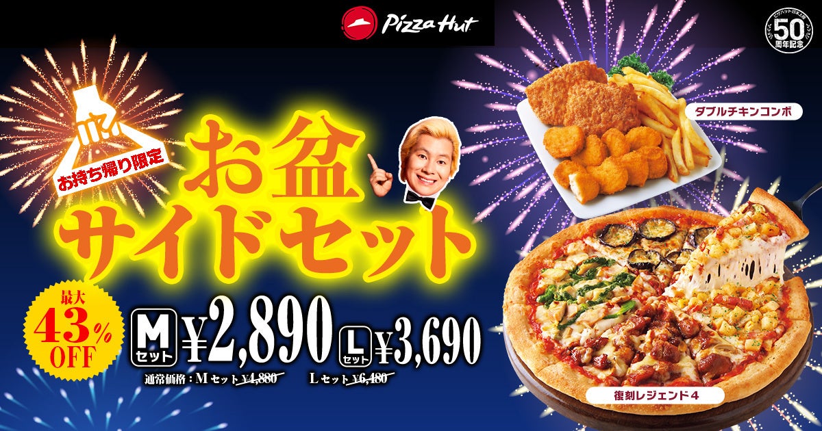 大人数でのパーティー向けの最大53%OFFのおトクなお持ち帰り限定「お盆3枚セット」をはじめ、最大5,550円OFFとなる「お盆パーティーセット」、普段のお食事にもピッタリな人気の「復刻レジェンド4」と「ダブルチキンコンボ」が最大2,790円OFFになる「お盆サイドセット」など、おトクなセットを販売いたします。