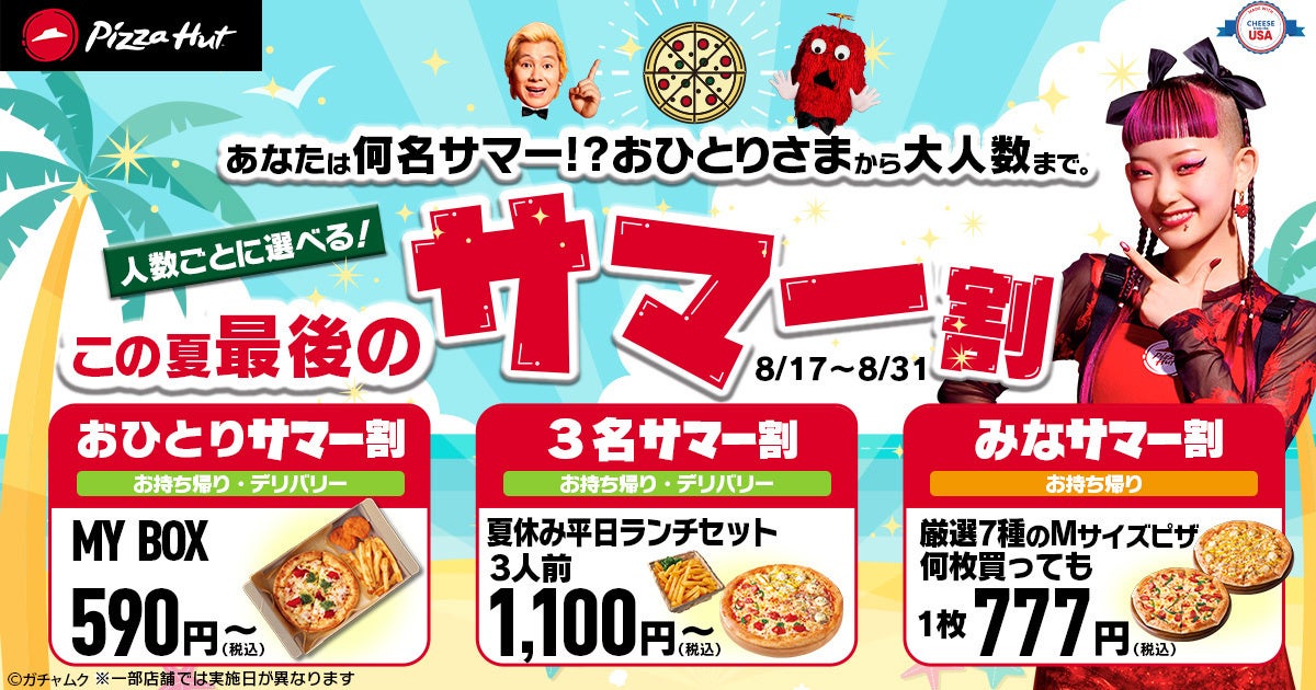 ピザハットは、今年の夏を最後までおトクに楽しく過ごせるよう、おひとり様から大人数まで様々なシーンでピザをおトクに楽しめる「この夏最後のサマー割」をご用意しました。