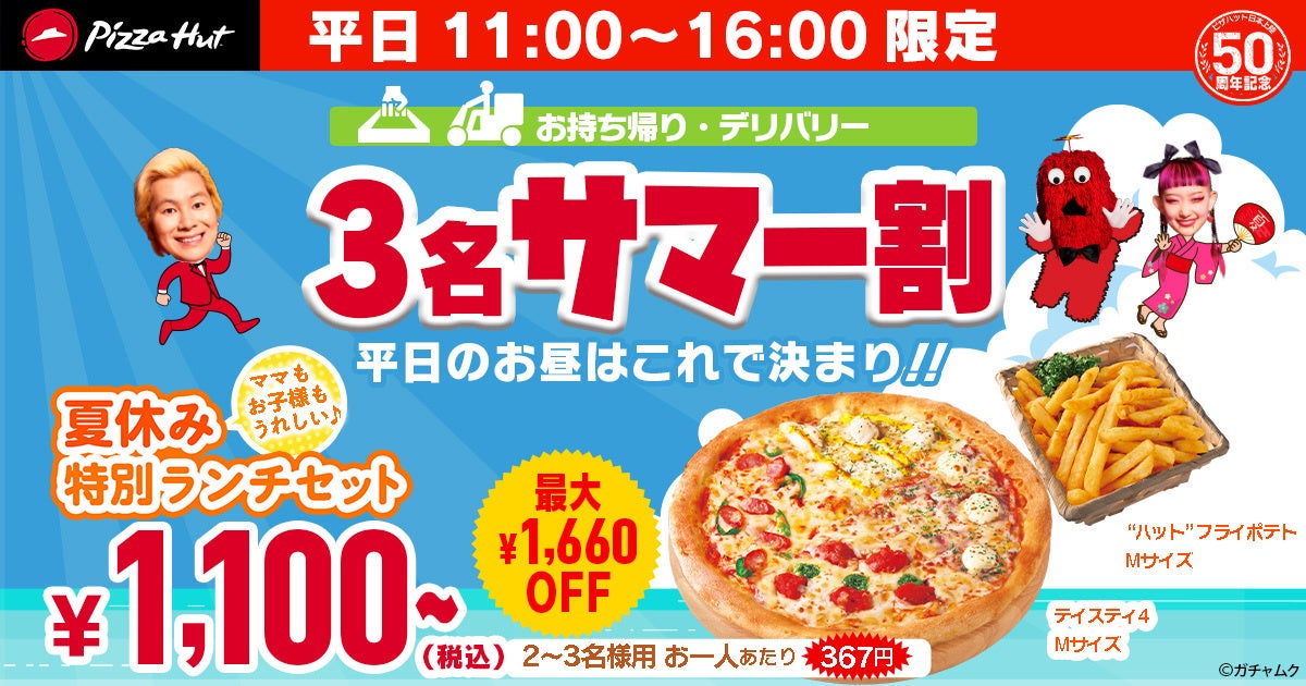 お昼をゆっくり過ごしたいママも、「お昼にピザが食べたい!」というお子様たちもハッピーになれる、大人気のピザテイスティ4と“ハット”フライポテトMのセットが最大1,660円おトクになる、平日ランチ限定の「3名サマー割」。