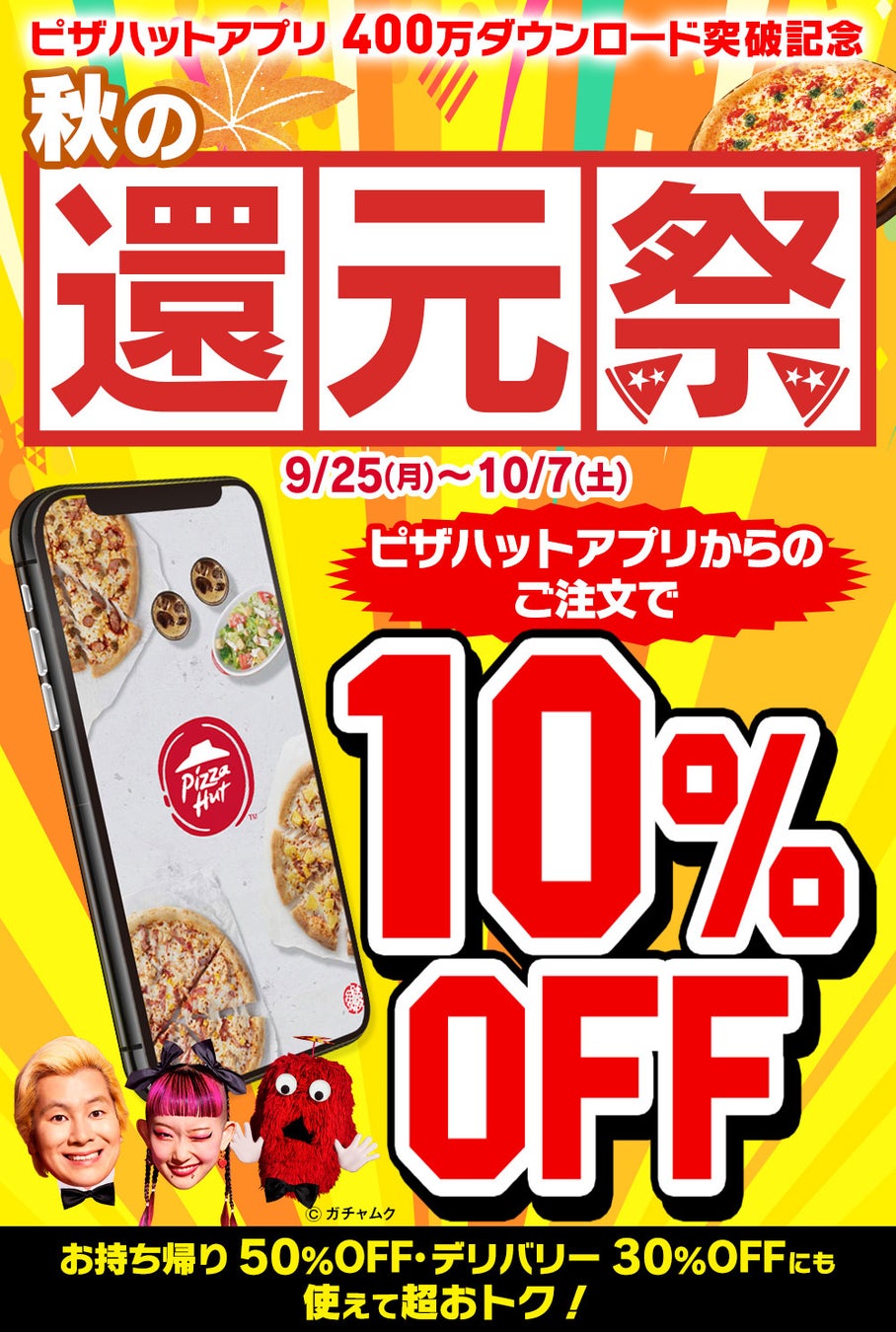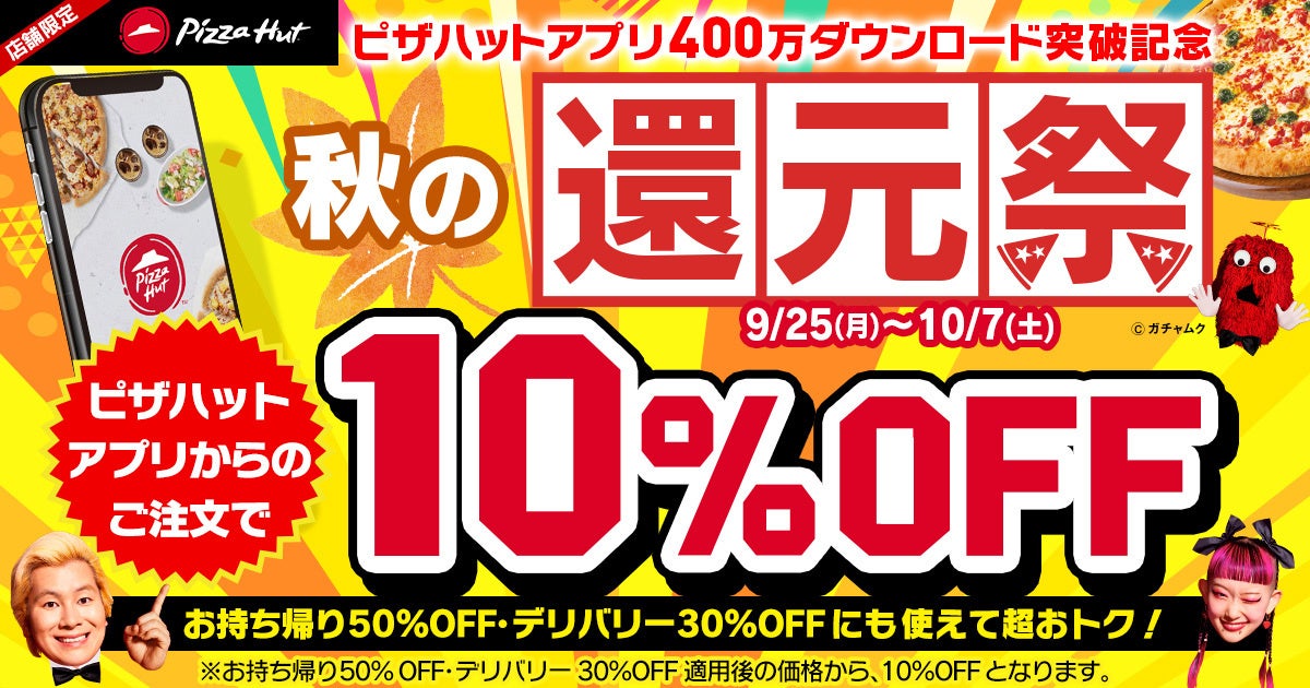 ピザハットは、公式アプリからの注文で全品10%OFFとなる「秋の還元祭」を2023年9月25日(月)〜10月7日(土)の13日間限定で開催いたします。