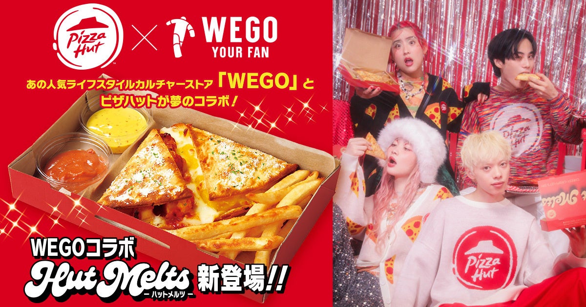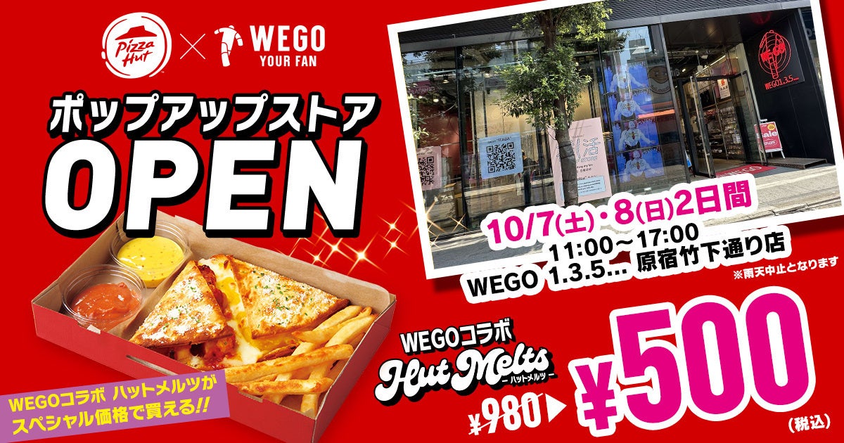 ピザハットはWEGOとのコラボ商品発売を記念して、10月7日(土)・8日(日)の計2日間、WEGO 1.3.5… 原宿竹下通り店前にてポップアップショップをオープンします。会場では、【WEGOコラボ Hut Melts(ヤンニョムチキン&コグマスイートポテト)】をお持ち帰り限定/数量限定にて、500円(税込)というスペシャルな価格で販売します。