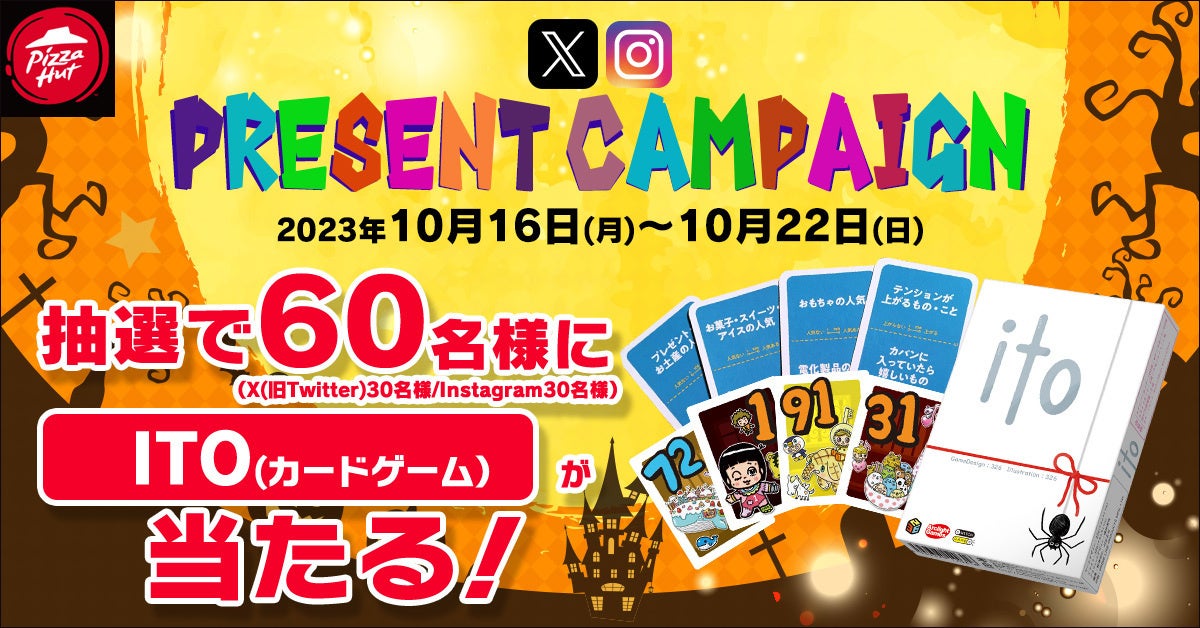 2023年10月16日(月)~10月22日(日)の間、ピザハット公式X(旧Twitter)アカウントと公式Instagramアカウントにて抽選で30名様ずつ計60名様にカードゲーム【ITO】が当たるキャンペーンを開催いたします。