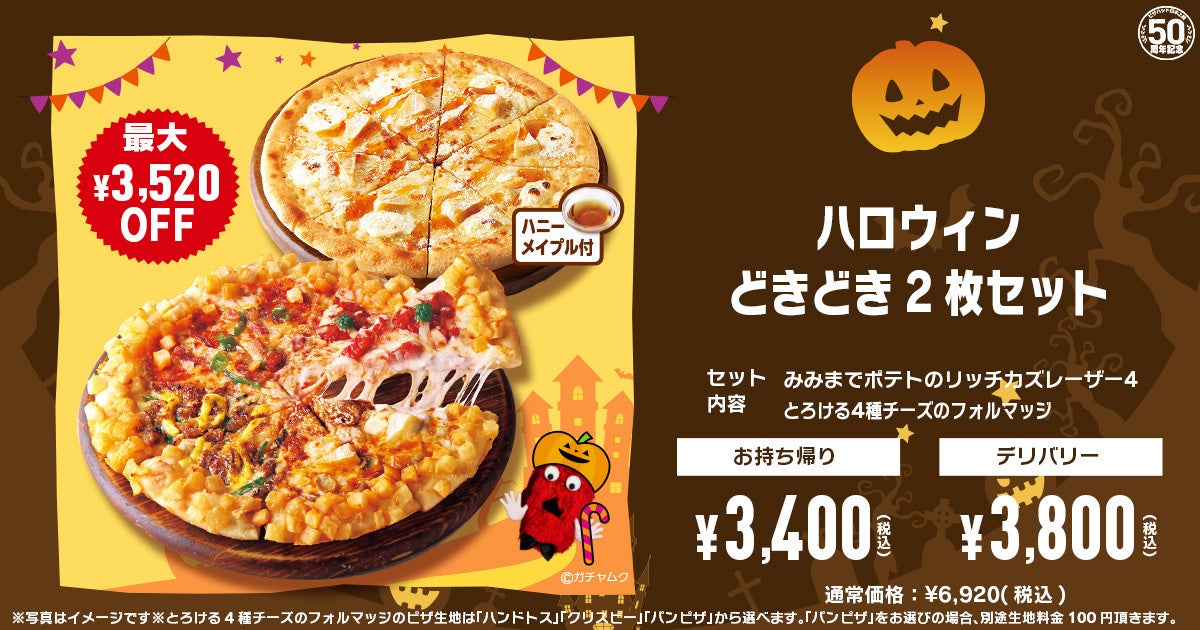 3つ目の限定セットは、「みみまでポテトのリッチカズレーザー4(Mサイズ)」と「とろける4種チーズのフォルマッジ(Mサイズ)」がセットで3,520円おトクに食べられる「ハロウィンどきどき2枚セット」。