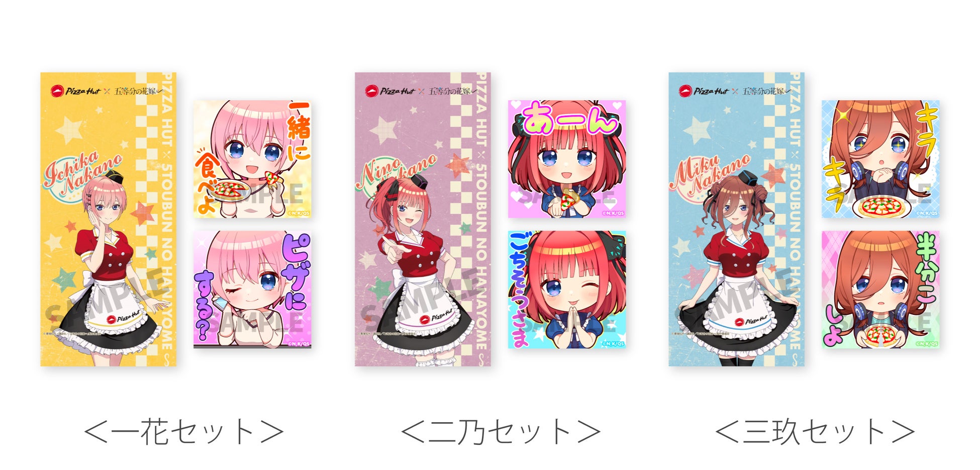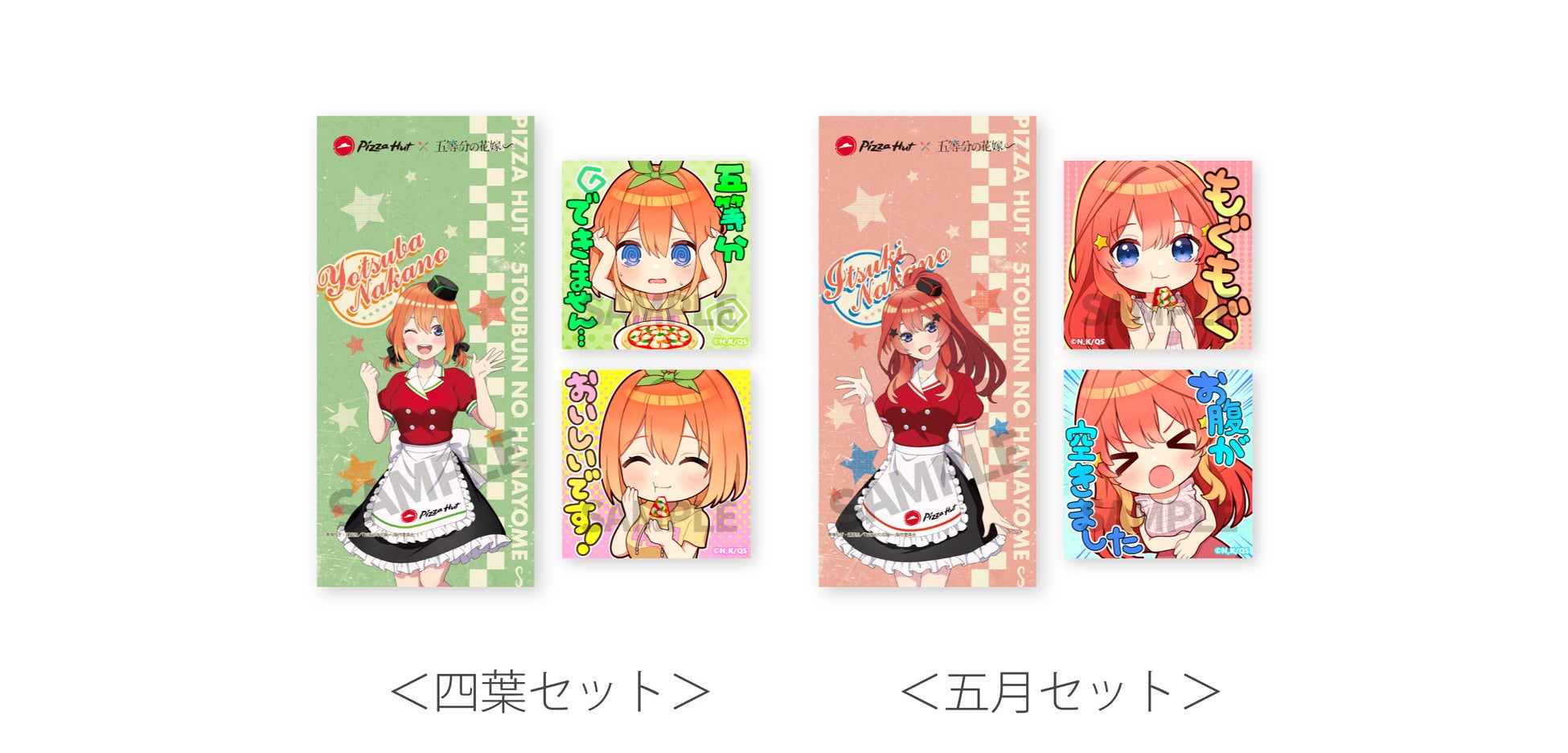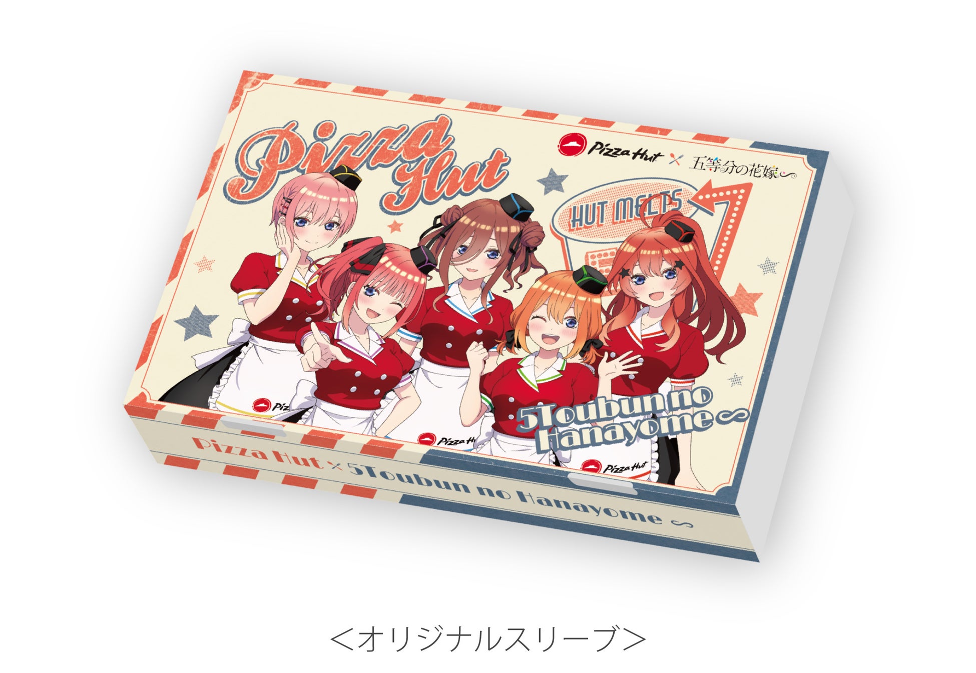 期間中に、ピザハットオンライン、または公式アプリにてディップスタイルピザ「Hut Melts(ハットメルツ)」をご注文の際、指定のクーポン『【五等分の花嫁∽】オリジナルスリーブ』をカートに入れてご注文された方に、各店舗数量限定でピザをオリジナルスリーブに入れてお渡しいたします。