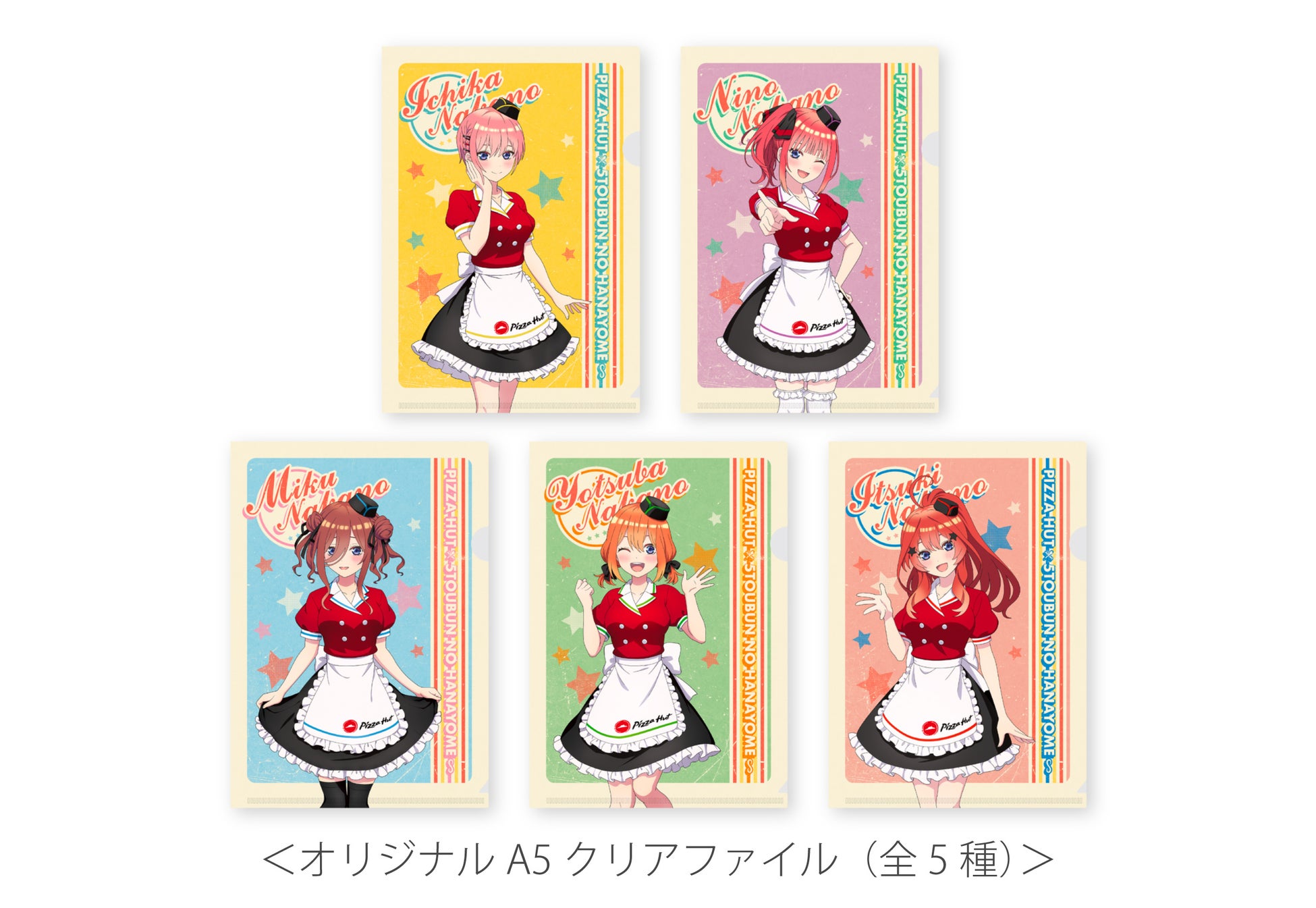 期間中に、ピザハットオンライン、または公式アプリにて税込1,000円以上(※1)ご注文の際、指定のクーポン『【五等分の花嫁∽】クリアファイル引換クーポン』をカートに入れてご注文された方に、各店舗数量限定でオリジナルA5クリアファイルをプレゼントいたします。