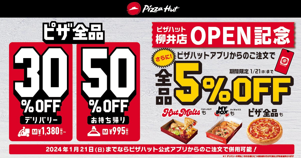 さらに、ピザハット柳井店のオープン記念キャンペーンとして、ピザハット公式アプリからのご注文で全品5%OFFでご提供いたします。2024年1月21日(日)までの7日間限定です。特にピザは「お持ち帰り50%OFF」「デリバリー30%OFF」に加えて、5%OFFとなりますのでとてもおトクです!