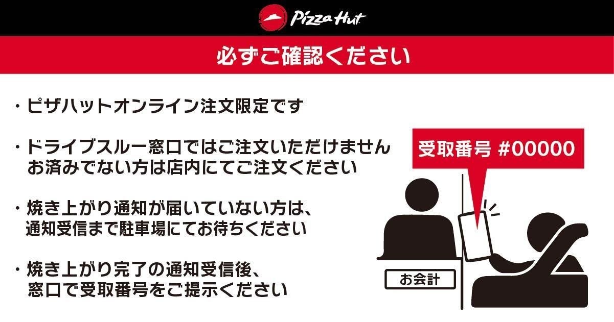 新しい受け取りサービス「オンライン専用ドライブスルー」は、ピザハットオンラインにて事前に注文した商品を、店舗のドライブスルー窓口で降車せずにそのまま受け取れるサービスです。