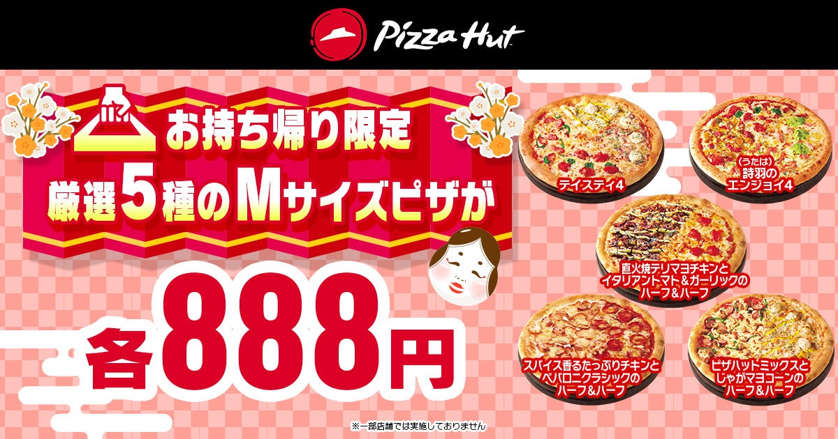 ※対象ピザ:「テイスティ4」「詩羽のエンジョイ4」「直火焼テリマヨチキンとイタリアントマト&ガーリックのハーフ&ハーフ」「ピザハットミックスとじゃがマヨコーンのハーフ&ハーフ」「スパイス香るたっぷりチキンとペパロニクラシックのハーフ&ハーフ」