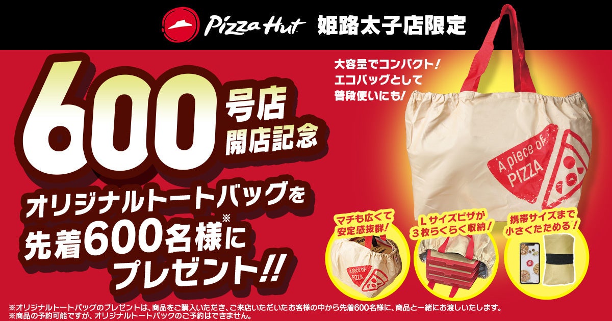 日本ピザハット株式会社(代表取締役社長:中村 昭一、本社:神奈川県横浜市、以下:ピザハット)が展開する世界最大級のピザチェーン「ピザハット」は、2024年4月26日(金)に日本国内600店舗目となる「ピザハット姫路太子(ひめじたいし)店」をオープンいたします。その新店舗オープンの記念として、姫路太子店で商品をご購入され、ご来店いただきました先着600名のお客様にピザハットオリジナルトートバッグをプレゼント!