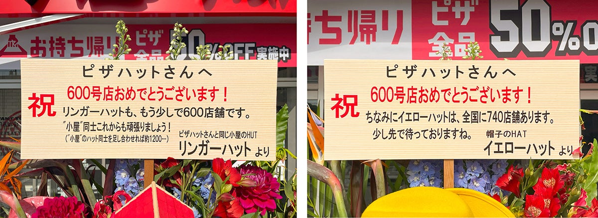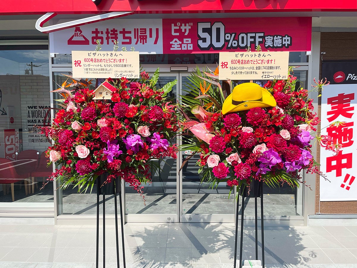また、26日のグランドOPENに合わせて、ハット同盟である「株式会社イエローハット」様や「株式会社リンガーハット」様からもそれぞれ暖かくユーモアのあるメッセージと豪華なスタンド花をお贈りいただき、祝いの気持ちを分かち合うようにこれからまた一丸となって成長していく意思を固めました。姫路地域としては4店舗目となるピザハット姫路太子店。地域の皆さまへ愛されるお店を目指し、邁進してまいります。