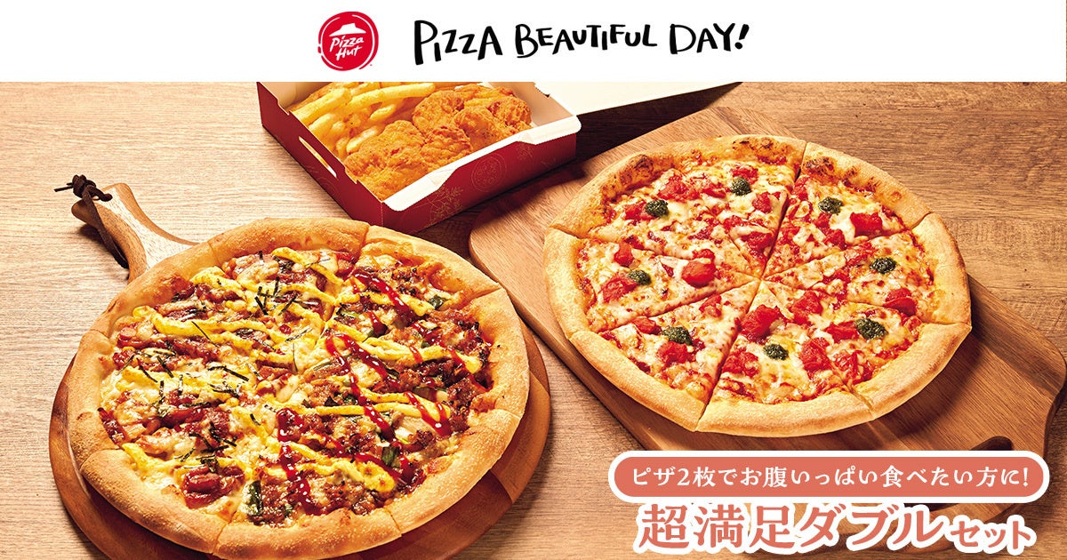 家族や友達と集まって食べるのなら、「超満足ダブルセット」がおすすめ!「直火焼 テリマヨチキン」「新・特うまプルコギ」のハーフ&ハーフに、選べるMサイズピザとチキポテコンボ(Mサイズ)がついてボリューム満点です!お肉系がっつりピザと爽やかなトマトソースピザのピザハット・マルゲリータで口福の無限ループといった楽しみ方はいかがでしょうか?