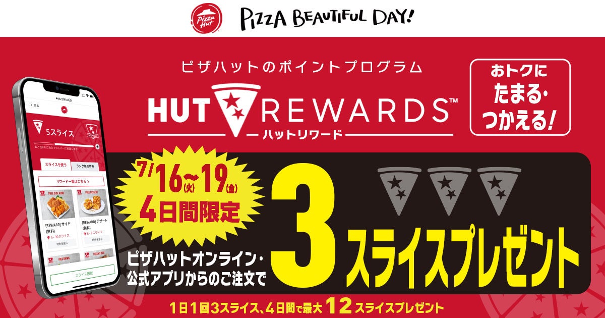 2024年7月16日(火)〜7月19日(金)のキャンペーン期間中は、ピザハットのメンバーシッププログラム「HUT REWARDS(ハットリワード)」でのポイントである「スライス」を会員様へ3スライスプレゼント。