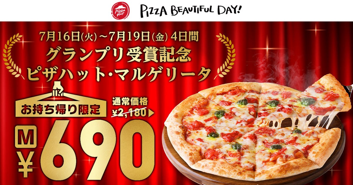 この宅配ピザ業界で日本初の快挙を記念して、ピザハットでは2024年7月16日(火)〜7月19日(金)の4日間限定で「受賞記念キャンペーン」を開催決定。この4日間は、第77回ジャパン・フード・セレクションでグランプリを受賞した「ピザハット・マルゲリータ」の美味しさを多くの皆様にお試しいただきたい気持ちを込めて、全国のピザハットにおいて「ピザハット・マルゲリータ」のMサイズをお持ち帰り限定で特別価格690円で販売させていただきます!