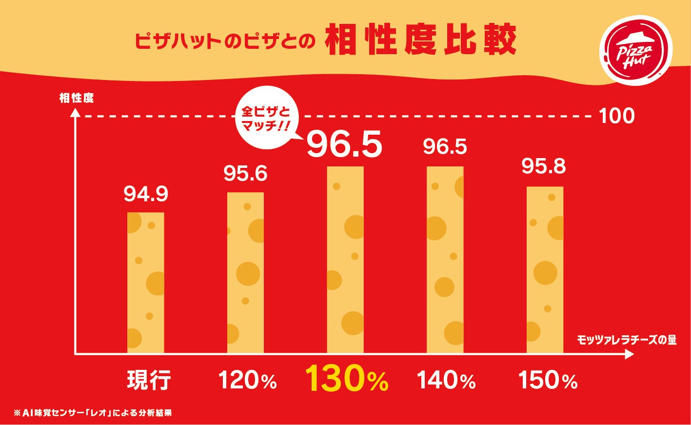 「レオ」を活用し、甘味、塩味、酸味、苦味、うま味の各要素を詳細に分析し、それぞれ数値化しました。その結果、現行のピザにチーズの量を120%から150%に増やすと、相性度が95点以上になり、「非常においしい」と評価されることが分かりました。