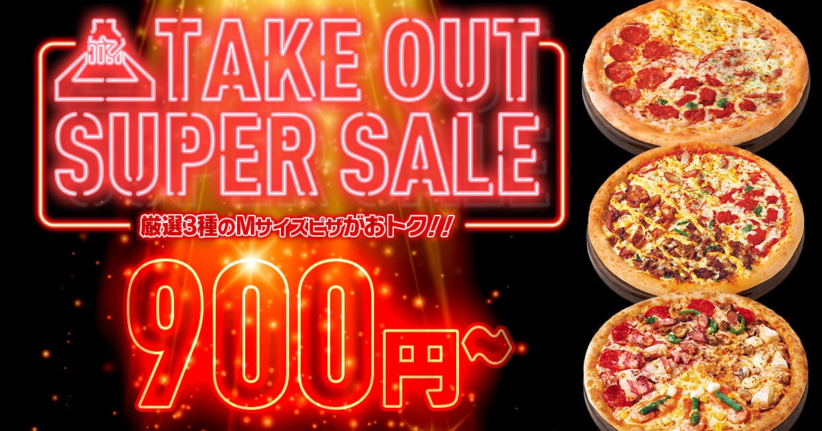 特大セール① テイクアウトスーパーセール:「3種の大人気ピザがお持ち帰り限定で900円〜になって登場!」