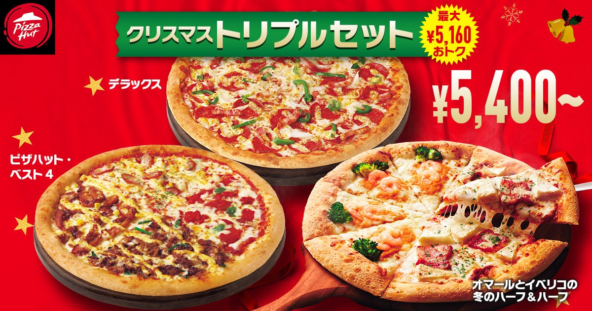 3つ目は「オマールとイベリコの冬のハーフ&ハーフ」に、「ピザハット・ベスト4」と具材たっぷりの「デラックス」を組み合わせた、最大5,160円もおトクなボリューム満点の「クリスマストリプルセット」です!