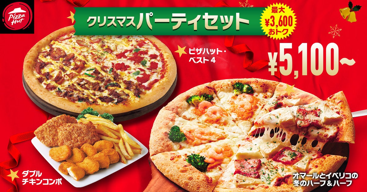 2つ目の「クリスマスパーティセット」は、1つ目のセットに加えて、定番の人気ピザ「ピザハット・ベスト4」も加わって、最大3,600円OFFとなるパーティにぴったりの豪華3点セット!