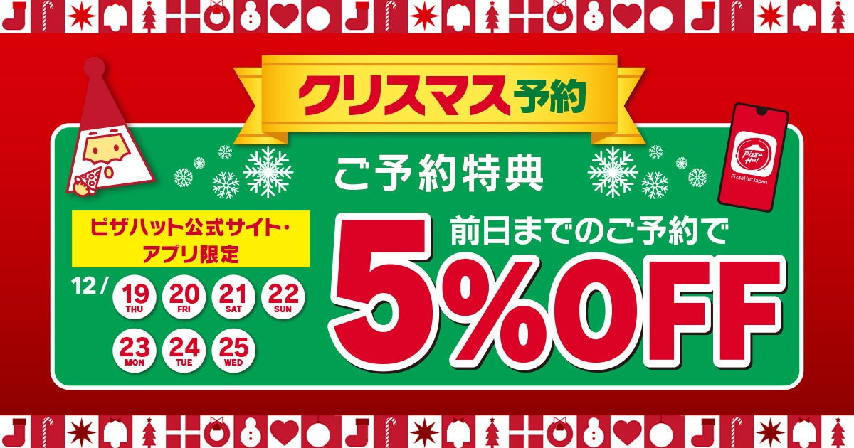 2024年12月19日(木)〜12月25日(水)の7日間はピザハット公式サイト・アプリを使ってお受け渡し日の前日までにご予約いただくと、ご注文全品がさらに特典で5%OFFになるおトクなキャンペーンを実施いたします!今年のクリスマスのご予約もお早めに!是非お待ちしております!