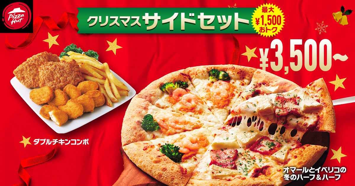 目玉商品となる「オマールとイベリコの冬のハーフ&ハーフ」は、レストラン品質といわれるほど製造から濃厚な風味にこだわった贅沢なオマールソースと、あふれ出る脂の甘みに定評があるイベリコ豚をふんだんに使用した、ピザハットが自信をもってご提供する豪華なハーフ&ハーフピザ。この特別なピザを、人気の「ダブルチキンコンボ」とセットにした「クリスマスサイドセット」では、なんとお持ち帰りなら3,500円からという驚きの価格でご提供!さらに、パーティにぴったりな「クリスマスパーティセット」や、最大5,160円もおトクになる「クリスマストリプルセット」もご用意いたしました。