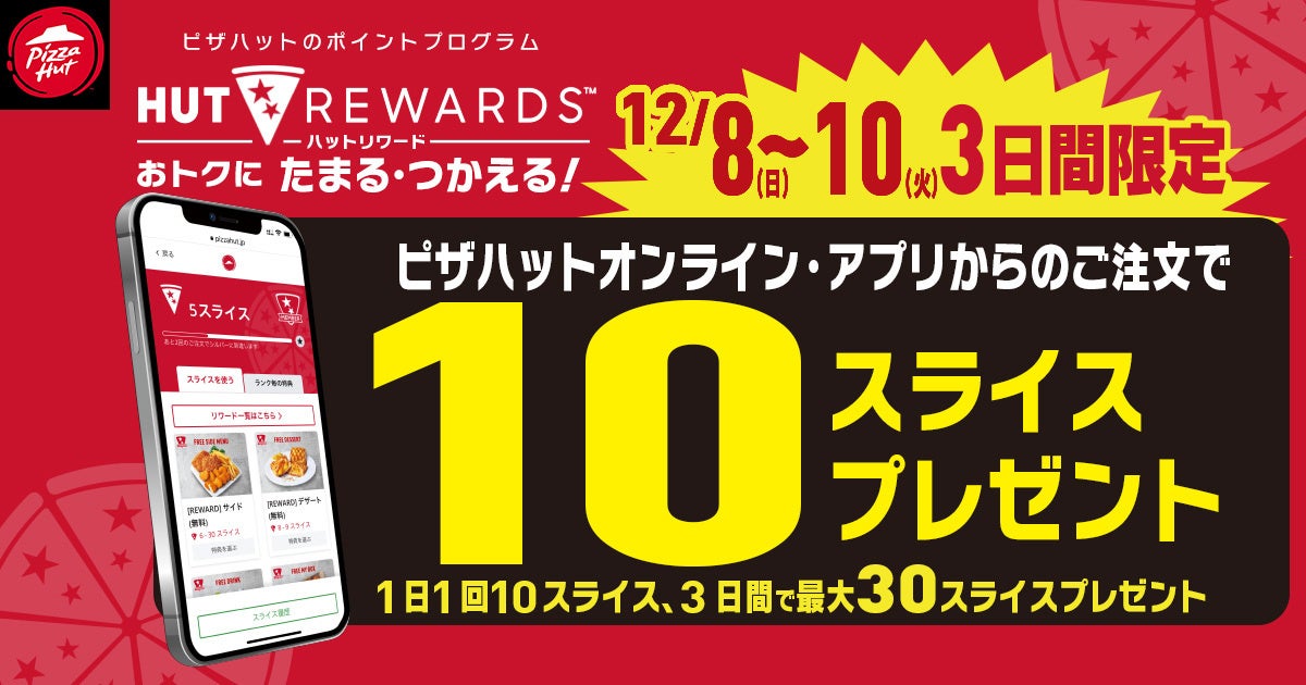 2024年12月8日(日)〜12月10日(火)の「ハットの日」期間中は、ピザハットのメンバーシッププログラム「HUT REWARDS(ハットリワード)」でのポイントである「スライス」を会員様へ1日最大10スライスプレゼント。