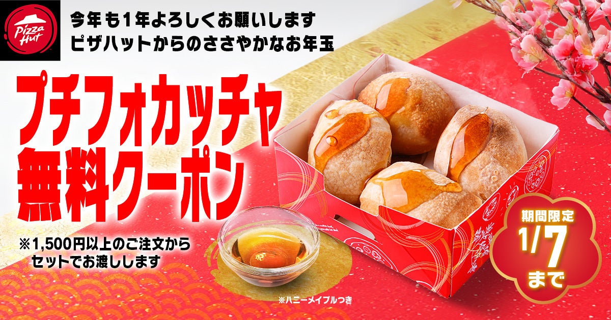 日本ピザハット株式会社(代表取締役社長:篠崎 幸男、本社:神奈川県横浜市、以下:ピザハット)が展開する世界最大級のピザチェーン「ピザハット」は、2025年1月4日(土)~1月7日(火)の4日間限定で、2024年の感謝と2025年への想いを込めて、期間中1,500円以上のご注文でプチフォカッチャが無料でついてくる特別クーポンキャンペーンを実施いたします!