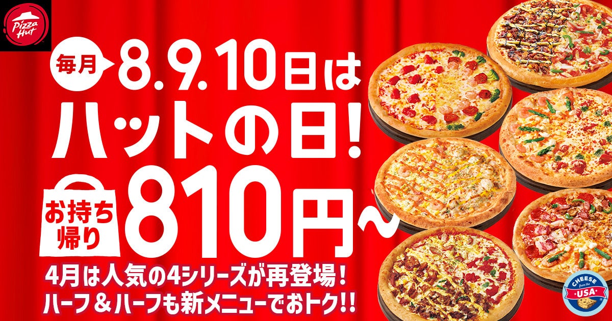 ピザハットでは、毎月8日・9日・10日を「ハットの日」として、毎月変わる対象商品をお持ち帰り810円〜でご提供しています。また、「ハットの日」対象商品をご注文いただくと、さらにサイドメニュー3種類も特別価格でお楽しみいただけるという、とってもおトクな3日間です!