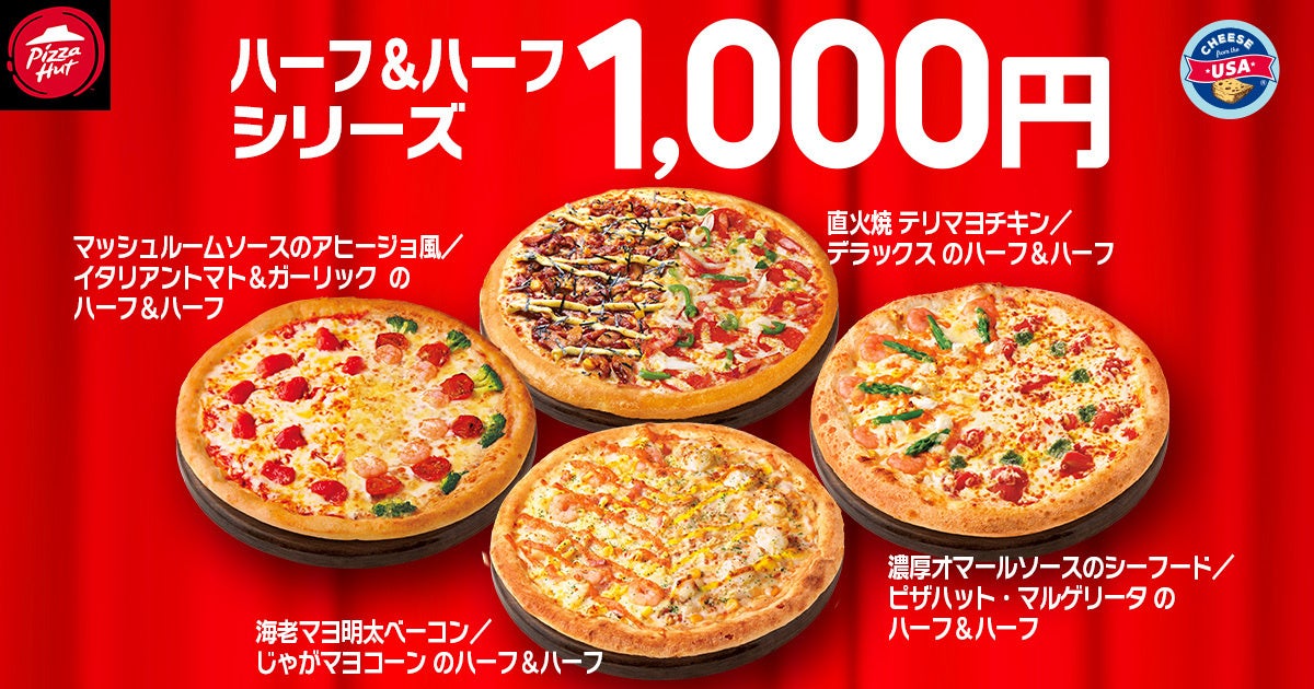 ※対象ピザ:「直火焼 テリマヨチキン/デラックスのハーフ&ハーフ」「濃厚オマールソースのシーフード/ピザハット・マルゲリータのハーフ&ハーフ」「海老マヨ明太ベーコン/じゃがマヨコーンのハーフ&ハーフ」「マッシュルームソースのアヒージョ風/イタリアントマト&ガーリックのハーフ&ハーフ」