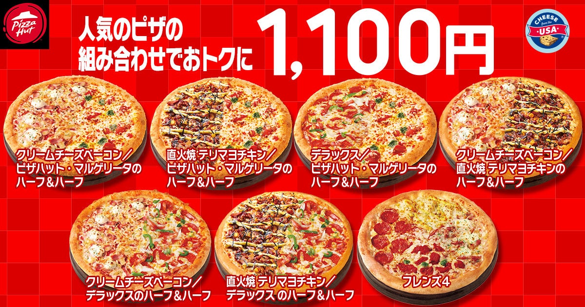 ※対象ピザ:「クリームチーズベーコン/ピザハット・マルゲリータのハーフ&ハーフ」「直火焼 テリマヨチキン/ピザハット・マルゲリータのハーフ&ハーフ」「デラックス/ピザハット・マルゲリータのハーフ&ハーフ」「クリームチーズベーコン/ 直火焼 テリマヨチキンのハーフ&ハーフ」「クリームチーズベーコン/デラックスのハーフ&ハーフ」「直火焼 テリマヨチキン/デラックスのハーフ&ハーフ」「フレンズ4」